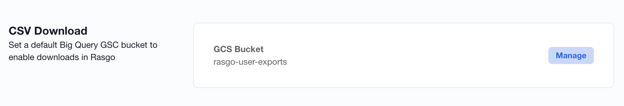 While using Rasgo, users have the ability to select a GCS bucket and download CSVs to it. This can be set in the User profile screen:
